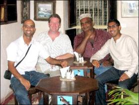 Naheed Barda [from left] at the Jahazi Coffee House with George Killeen, shop owner Abdallah and Aziz Batada.