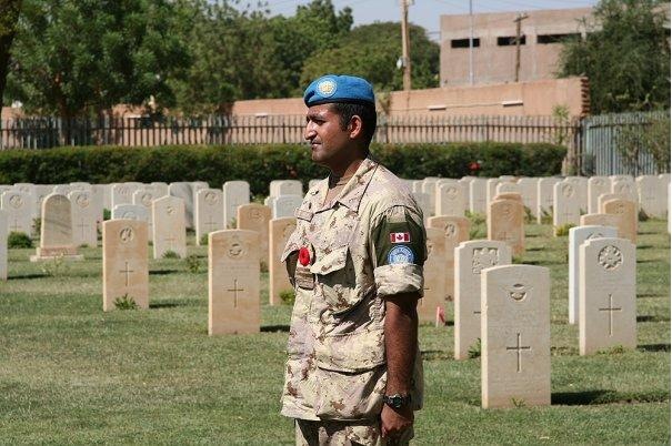 Captain Aleem Sajan cut quite a striking figure standing at attention in his UN Blue Beret and Desert Fatigues in the Khartoum War Cemetery. As an officer in the Canadian Armed forces he was participating in the Remembrance Ceremony during his UN tour in 2005.