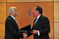 AKDN – 12 July 2008 – Lisbon, Portugal – Aga Khan University (AKU) and the Catholic University of Portugal (UCP), today signed an agreement of academic collaboration as part of their efforts to foster international understanding and scholarly cooperation between diverse cultures and faiths. Areas of collaboration between the two universities will include culture, law, religion, ethics, health sciences, education and human development through joint research, training initiatives, and exchange programmes for faculty and students. Professor Manuel Braga da Cruz, Rector of the UCP and Firoz Rasul, President AKU, signed the Memorandum of Understanding at the Ismaili Centre in Lisbon.