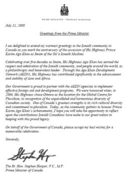 Prime Minister of Canada The Rt. Hon. Stephen Harper, P.C., M.P. extends Imamat Day greetings to Ismaili Muslim Community.