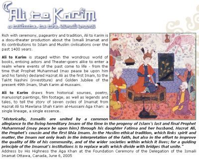 A Tribute to the Ismaili Imams recounts the story of our 49 Imams in seven episodes. It traces the unbroken thread of Imamat through the tapestry of Muslim civilizations woven over 1400 years of history. Staged in the wondrous world of books, it entices the audience into a realm where past and present mingle and come to life.