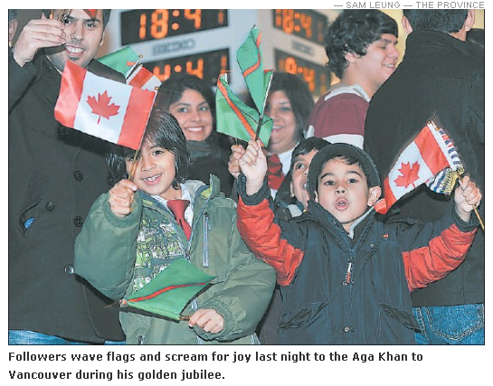 Shrieks from the crowd and the wails of the Vancouver Police Department bagpipe band accompanied the Aga Khan’s convey as it rolled up in front of the Pan Pacific hotel.