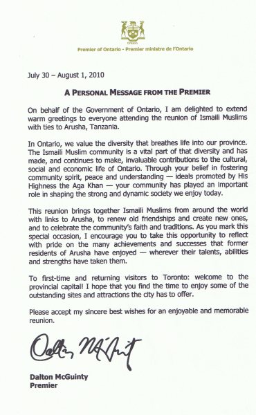 Ontario Premier personal message on Ismaili Muslim ReunionPremier McGuinty’s comments are contained in a special message sent for the reunion of Ismailis with ties to Arusha, Tanzania.