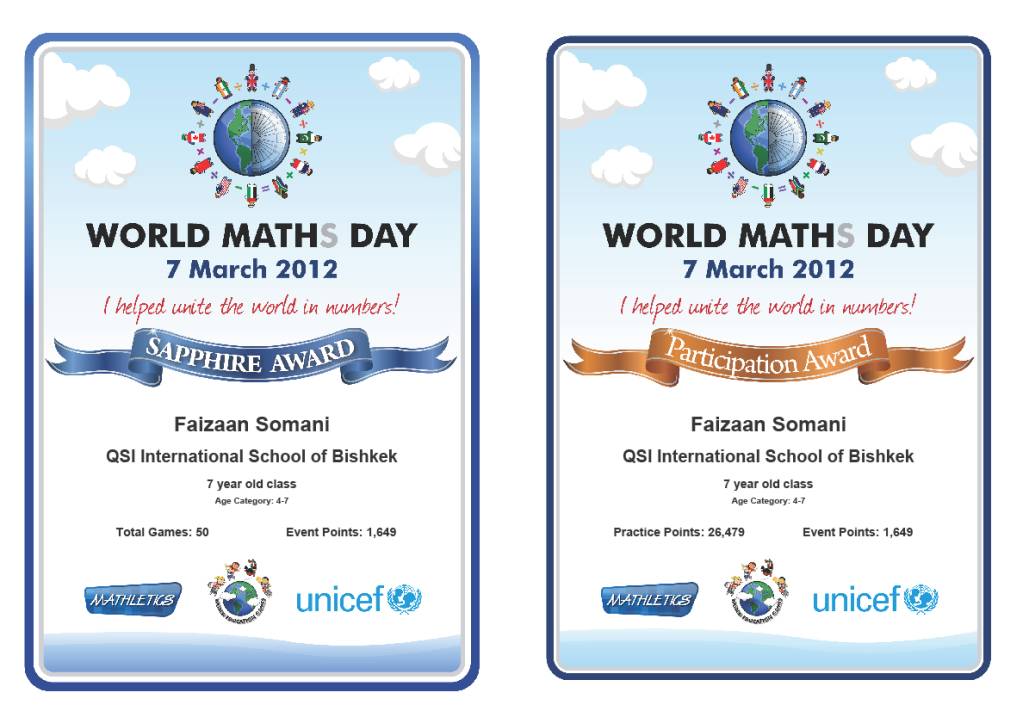 Faizaan Somani scored highest points in World Education Games 2012 (Science and Spelling Contests) throughout QSI International School of Bishkek and entire Kyrgyzstan. He also scored second highest points in Maths contest. This was his first experience with the World Education Games, organized online and hosted at Australia. More than 5.9m participants from 240 countries/territories registered for the event and more than 1.57m participated in the event organized on 6-8 March 2012.