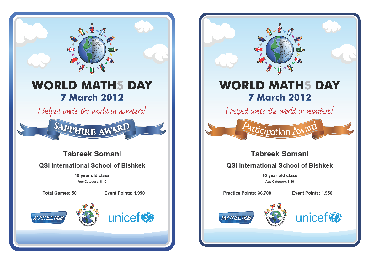 Tabreek Somani topped in World Education Games 2012 (Maths Contest) throughout QSI International School of Bishkek and Kyrgyzstan. She also scored second highest points in Science and Spelling contests. World Education Games 2012 were organized online and hosted by Australia. More than 5.9m participants from 240 countries/territories registered for the event and more than 1.57m participated in the event organized on 6-8 March 2012.