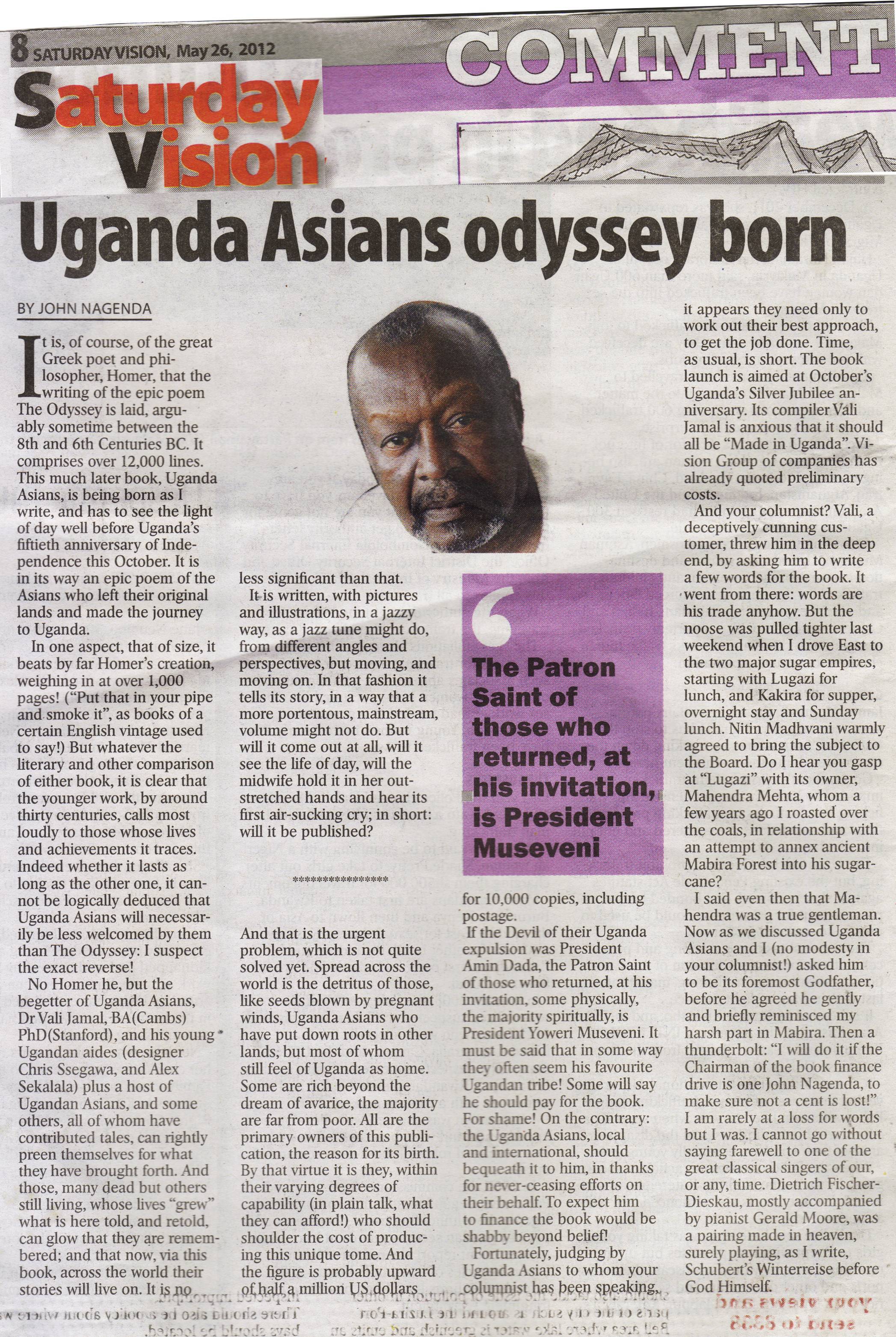 Article on Vali Jamal’s book: Uganda Asians: Then and Now, Here and There, We Contributed, We Contribute (1250 pp+-> 4000 images, 5.4 kg, $72.50), forthcoming September 2012 in three parts.