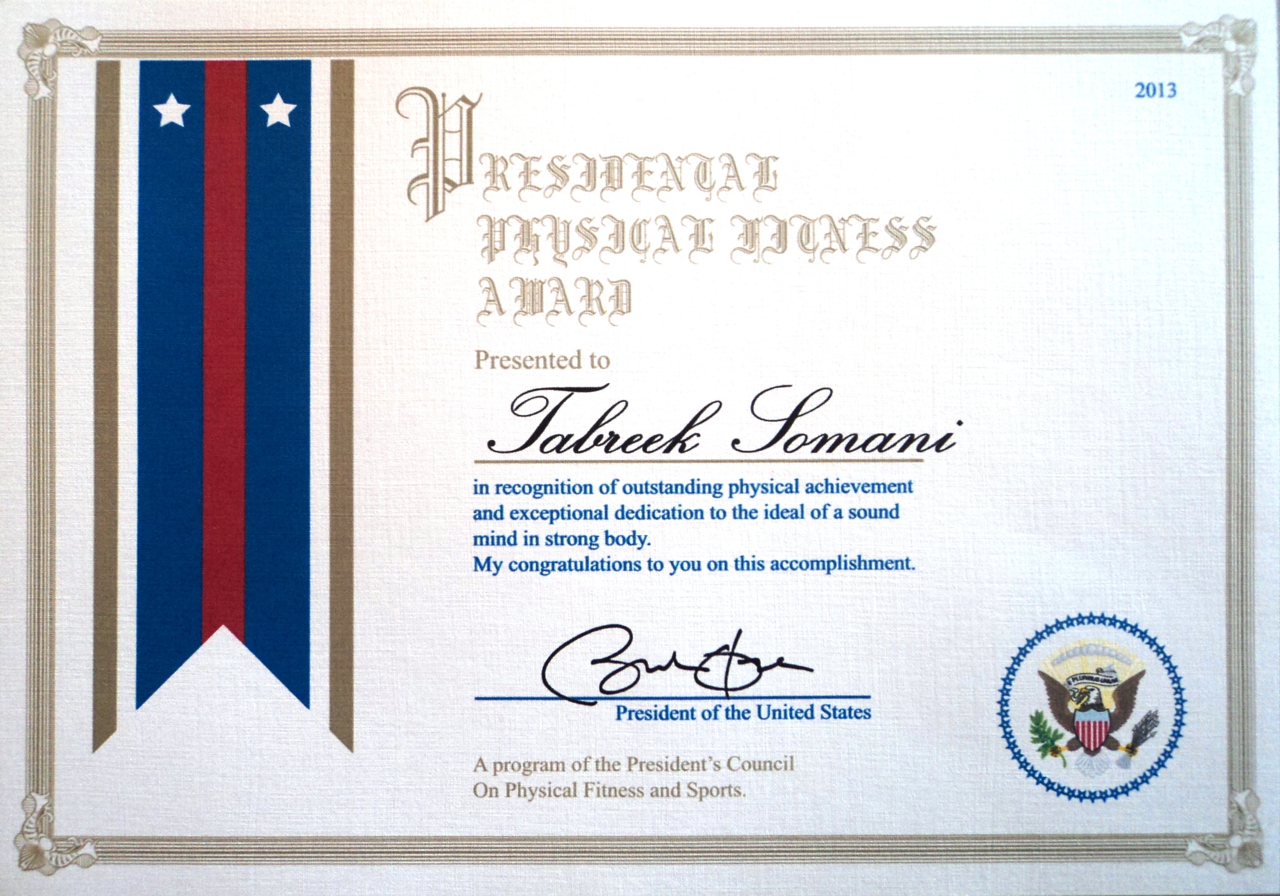 Successful completion of the 11 year old program (she received As in 68 modules)- Presidential Physical Fitness Award singed by the President of the United States