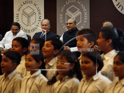 The Aga Khan, spiritual head of Ismaili Muslims, rear center, Andhra Pradesh state Chief Minister N. Kiran Kumar Reddy, left, and Minister for Human Resources Development M.M. Pallam Raju attend the inauguration of the Aga Khan Academy as children sing, in Hyderabad, India, Friday, Sept. 20, 2013. AP Photo/Mahesh Kumar A.