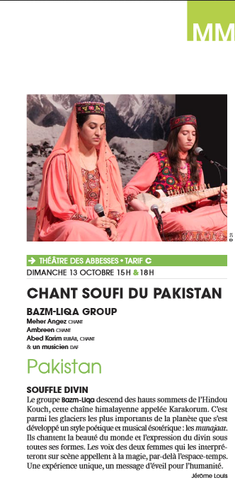 The Bazm-Liqa group come down from the high peaks of the Hindu Kush, the Himalayan range called Karakorum. They sing the beauty of the world and the expression of the divine in all its guises. Their music is a unique experience and a message of awakening for all mankind.