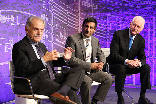 Dr. Alberto Sangiovanni Vincentelli, Rahman Jamal and Dr. James Truchard discussing the challenges of the technological systems of tomorrow. Photo credit National Instruments Germany GmbH