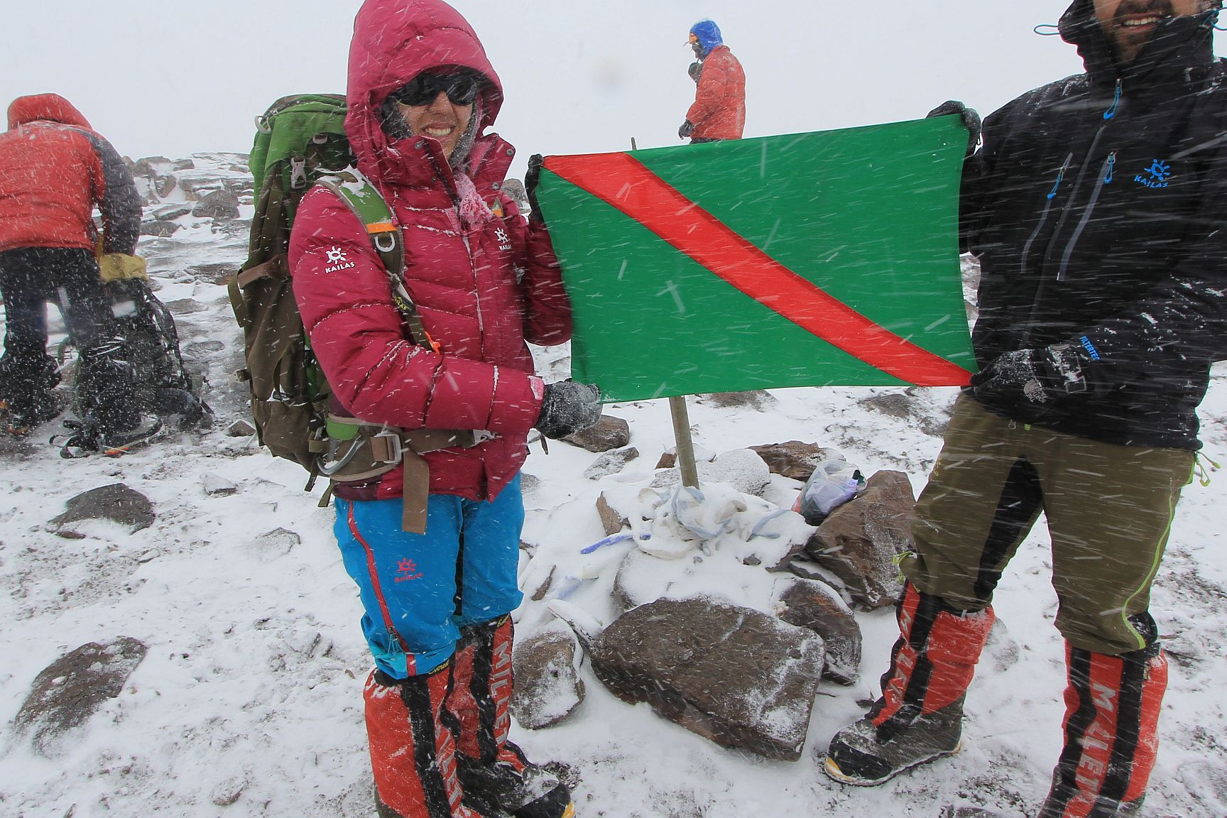 Samina Baig and Mirza Ali holding the Ismaili Flag after reaching the Summit of Mt. Aconcagua – located in the Andes mountain range, in the province of Mendoza, Argentina