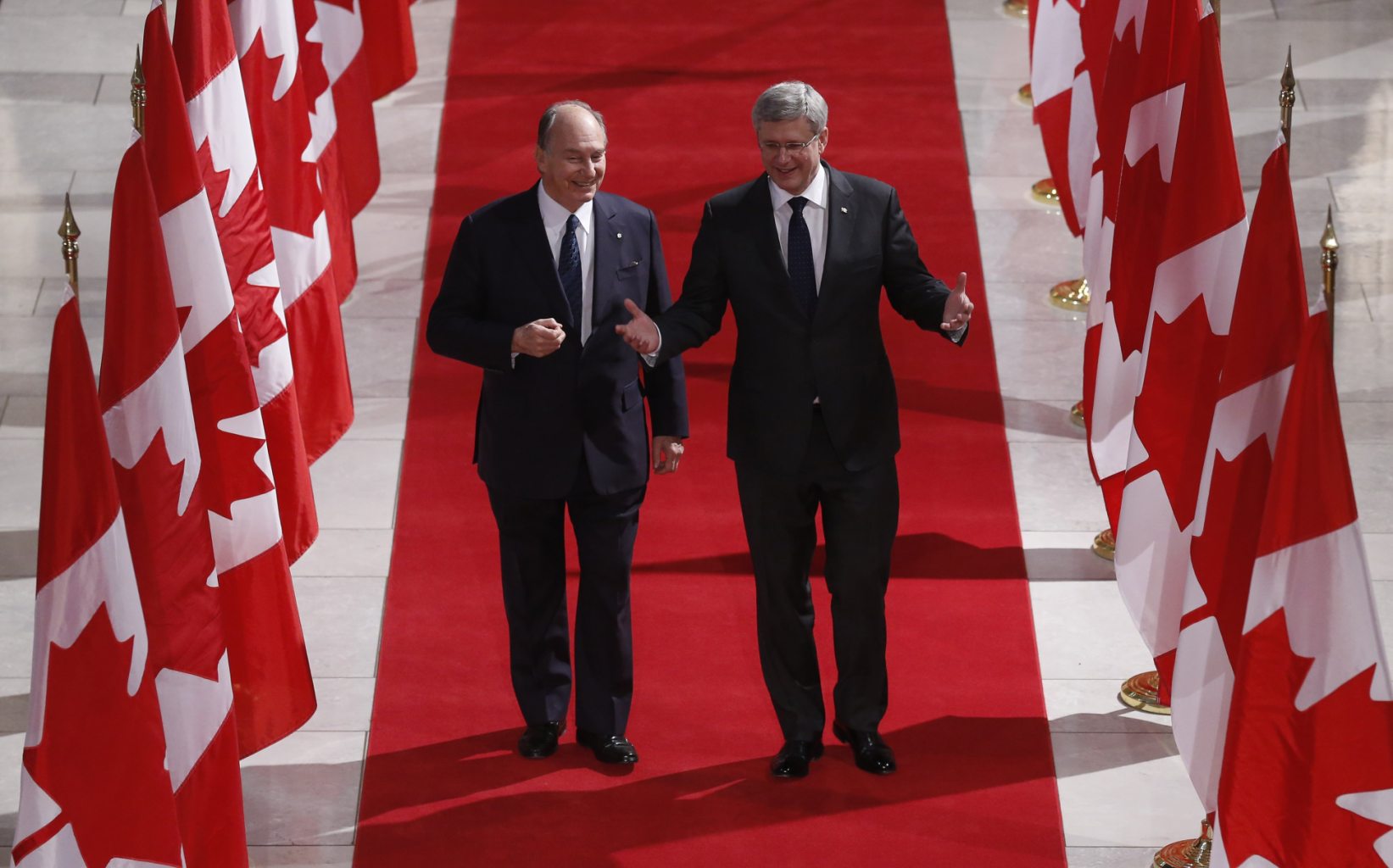 Canada’s Prime Minister Stephen Harper (R) walks with the Aga Khan, spiritual leader of Ismaili Muslims, in the Hall of Honour on Parliament Hill in Ottawa February 27, 2014. REUTERS/Chris Wattie (CANADA)