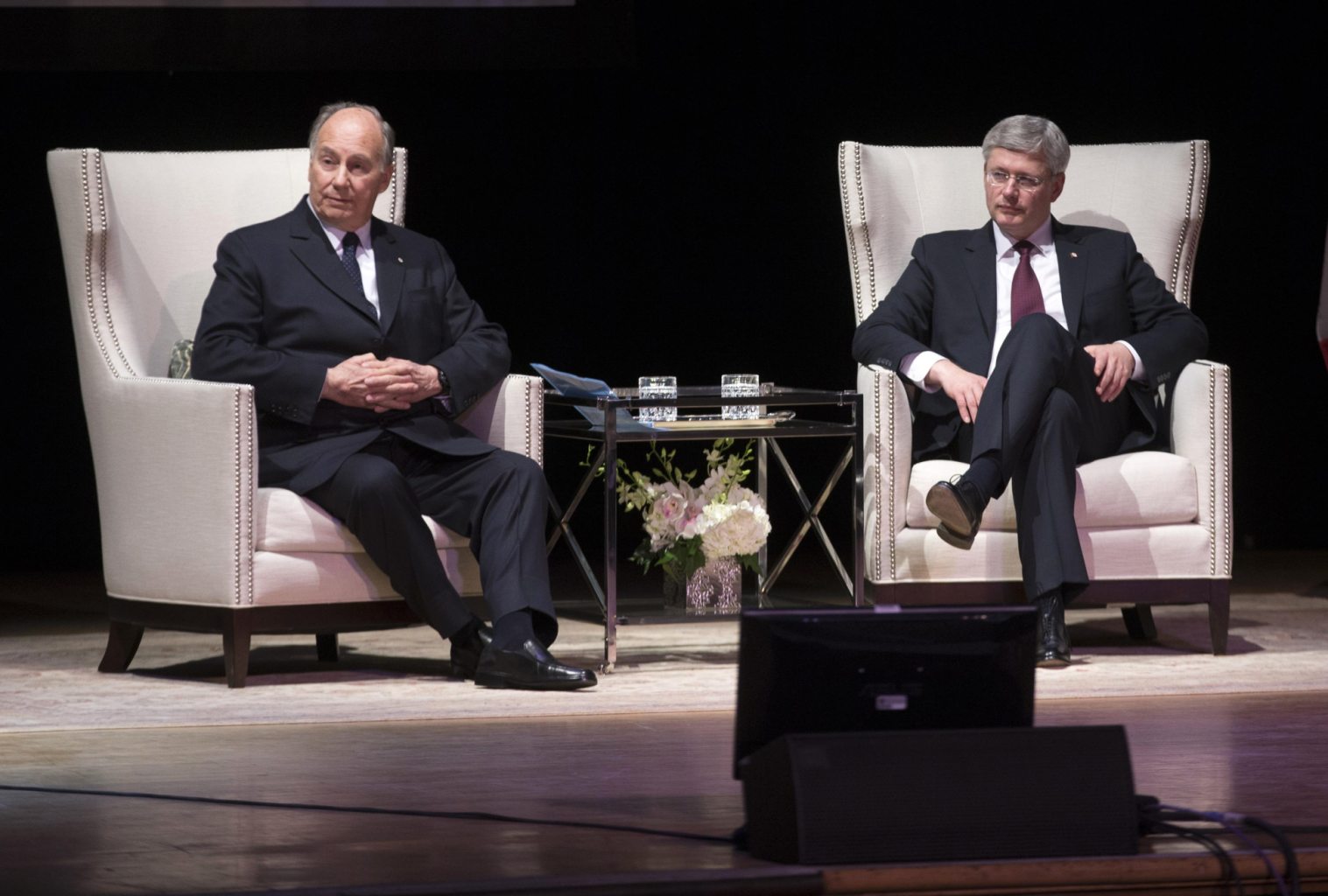 Canada’s Prime Minister Stephen Harper (R), sits with the Aga Khan, the spiritual leader of Ismaili Muslims, during a speaking event at Massey Hall in Toronto, February 28, 2014. REUTERS/Mark Blinch (CANADA)