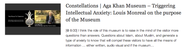 Constellations – Aga Khan Museum – Triggering Intellectual Anxiety – Louis Monreal on the purpose of the Museum September 2, 2014 Constellations | Retrospective: Artistic Renderings of the Aga Khan Museum, Ismaili Centre and their Park 728 × 197