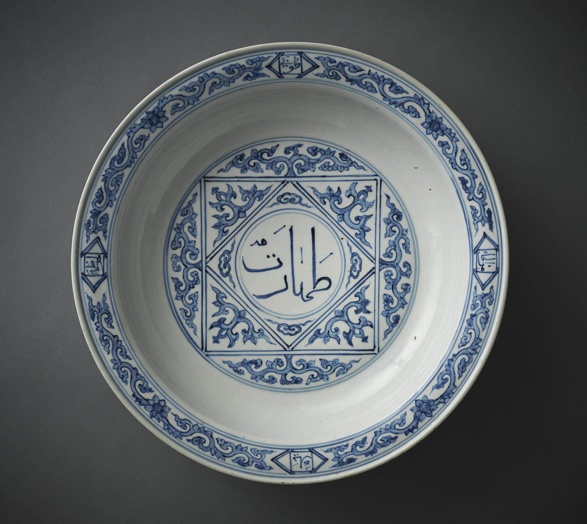 An Ablution Basin was ordered by Chinese Emperor Zhengde (reigned 1505-21) for a member of his court that was Muslim. The mark on the back of the plate is from the emperor. “The overall message conveyed by the Arabic symbol Taharat (Purity) is one of harmony, between the Islamic world and China,” Kana’an concluded.