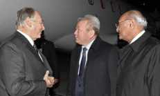 Mawlana Hazar Imam is received by Minister Kanat Sadykov and AKDN Representative Shamsh Kassim-Lakha upon his arrival in Bishkek. (The Ismaili – AKDN / GARY OTTE)