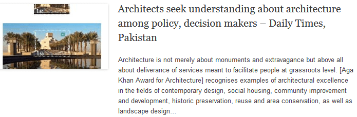 “The very first Aga Khan Award for Architecture was presented in 1980 at the Shalimar Gardens in Lahore. It was an event whose importance was recognised by the Government of Pakistan, which issued a stamp featuring the gardens.”