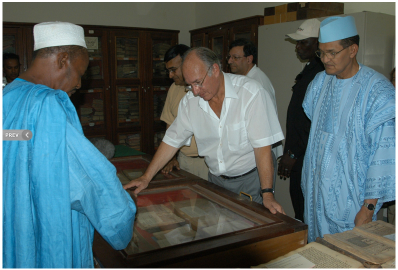His Highness the Aga Khan (centre) and Prime Minister Ahmed Mohamed Ag Hamani (right) examining ancient manuscripts at the Ahmed Baba Centre in Timbuktu, Mali. – Photo AKDNGary Otte