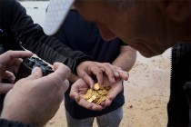 Kobi Sharvit of The Israel Antiquities Authority holds Fatimid period gold coins that were found in the seabed in the Mediterranean Sea near the port of Caesarea National Park in Caesarea, Israel, Wednesday, Feb. 18, 2015. A group of amateur Israeli divers have stumbled upon the largest collection of medieval gold coins ever found in the country, dating back to the 11th century and likely from a shipwreck in the Mediterranean Sea. (AP Photo/Ariel Schalit)