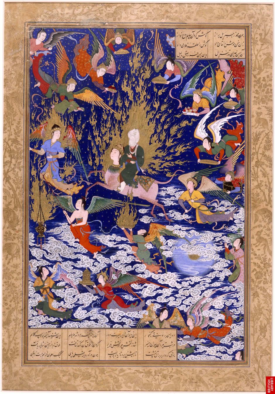 Miʿrāj, is the legend of the ascension of Prophet Muhammad into heaven, generally celebrated on the 27th day of Rajab, Laylat al-Miʿrāj (“Night of the Ascension”), although there is no unanimous opinion on the precise date The legend states that the Prophet was taken from Mecca to Jerusalem by Angel Gabriel on a winged, white horse, Buraq, from where he ascends through the seven heavens and is greeted by, and in effect validated by the previous Prophets (Adam, Joseph, Aaron, Moses, Abraham, and Jesus). At the culmination, he sees the lote tree, the Divine Throne, the “house of life” (al-bayt al-mamur – the celestial counterpart to the Kaba).
