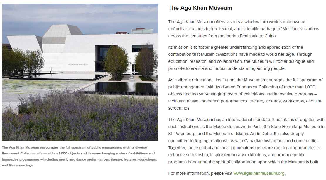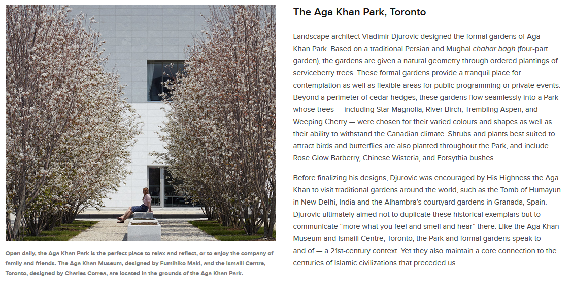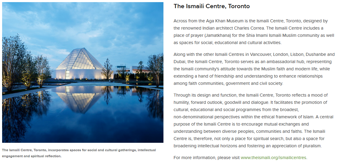 The Aga Khan Museum, designed by Fumihiko Maki, and the Ismaili Centre, Toronto, designed by Charles Correa, are located in the grounds of the Aga Khan Park.