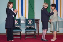Dr. Saida Rasul in conversation with British Columbia Lt.-Gov. Judith Guichon as British Columbia Premier, Christy Clark looks on.