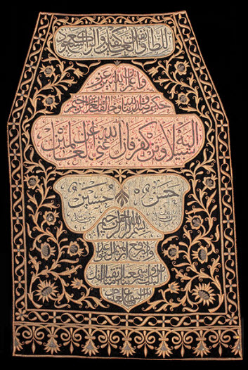 The four corners of the Ka’ba, an irregular cube, are generally aligned with the four points of the compass. A black silk cloth, the kiswa, embroidered with Qur’anic verses covers the Ka’ba and is replaced annually, a practice that originated during medieval Muslim history. The fabrics of the previous kiswa were traditionally distributed between the ruler of Mecca, the gatekeepers of the Ka’ba, and other prominent people of Mecca who cut the textiles into fragments and sold them to pilgrims as souvenirs of the hajj. Hence, a large number of fragments of these fabrics now exist in museums and private collections. The empty interior of the Ka’ba is customarily cleaned before the hajj.