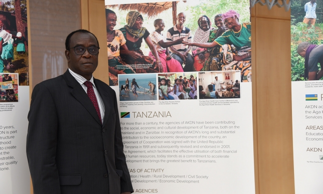 Tanzanian Ambassador Jack Mugendi Zoka stands next to a banner describing the work of the AKDN in his country. (Image credit: AKDN / Safiq Devji)