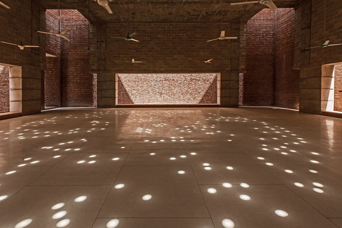 Column free prayer hall is raised on eight peripheral columns, in addition to four light courts, random circular roof openings allows daylight into the prayer hall creating an ornate pattern on the floor enhancing spirituality through light . AKTC / Hassan Saifuddin Chandan