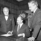 November 3, 2016 Countdown to Diamond Jubilee – Snapshots of Imamat – 1983 to 1987 300 × 305 Mawlana Hazar Imam signing the agreement to expand the Aga Khan Program for the Islamic Architecture at MIT and Harvard University, 1985. Photo: UK Ismaili