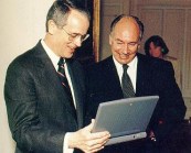 January 8, 2017 Countdown to Diamond Jubilee – Snapshots of Imamat – 1993 to 1997 322 × 260 President Charles Vest of MIT demonstrates a notebook presented to Mawlana Hazar Imam by MIT in Boston, 1996. Photo: via Pinterest