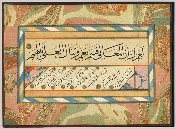 Album of Calligraphies of Prophetic Traditions February 2, 2017 The style and quality of illumination added value to the book as a treasured object 577 × 423 Page from an Album of Calligraphies of Prophetic Traditions (Hadith), ca. 1500; Ottoman Signed by Hamdullah ibn Mustafa Dede, Istanbul. Image: Sheila Blair.