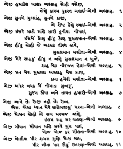 | Eji Mere Shahku(n) Hindu na jaañe, Musalmaan na buje Shah betha niranjan hoi, e-bi Allah….5 |