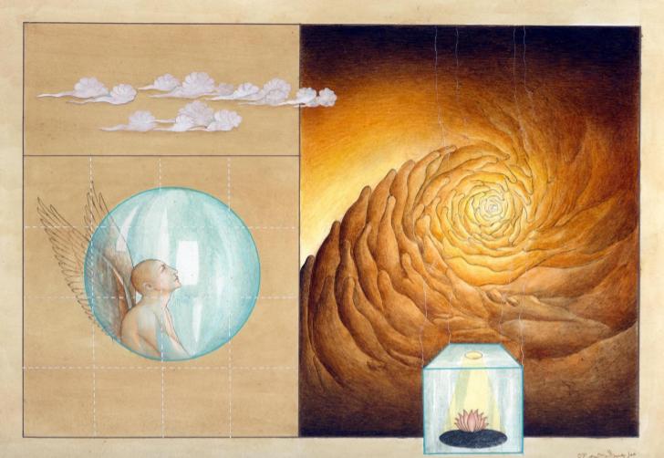 In this painting, I have portrayed the life, death and the time we spend in this world. Every soul has to return to its source until it would be unadulterated. Glass aquarium symbolize fragility of life and also a prison for soul. It is a journey of soul and it is called “Pull e Sirat” – “Right Path” (Siraat al-Mustaqim) of this world – the path of our Ahlul Bayt (peace be upon them); in Sura Fatiha, Siraat al-Mustaqim refers to both of these paths: the path of the Ahlul Bayt and Pul-e-Siraat. There are certain levels of divinity one can attain and become angel.