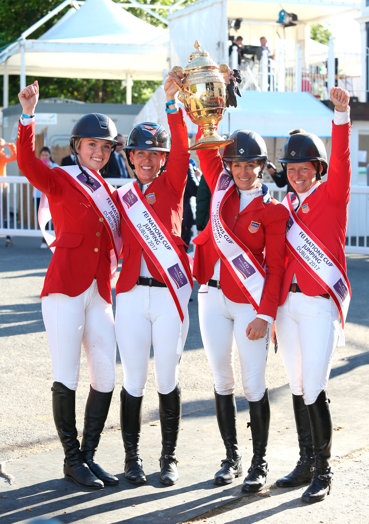 This was the first all-female team triumph in the 91-year history of Nations Cup Jumping competition for the world-famous Aga Khan Cup at the Dublin Horse Show in Dublin, Ireland.