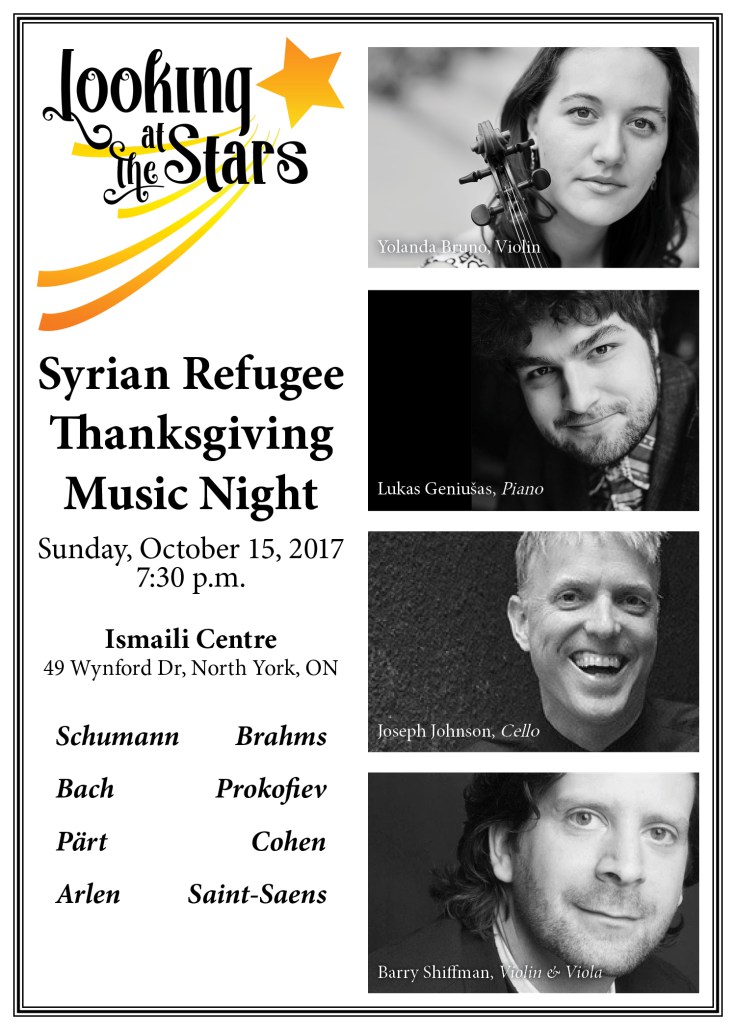 Looking at the Stars Foundation is presenting a very special musical gift to Syrian refugees on Sunday, October 15, 2017, at 7:30 p.m. The concert will be presented in the Social Hall at the Ismaili Centre, 49 Wynford Dr, North York, ON. Donations gratefully accepted to support this exciting project. Visit http://lookingatthestars.org/donate/ for more information.