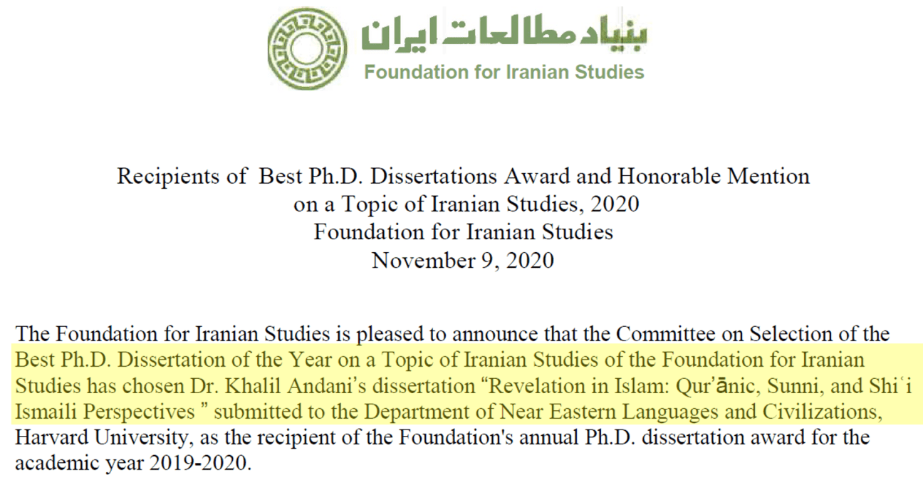 “Khalil Andani has made an exceptional contribution to the field of Iranian and Middle Eastern Studies by, among other achievements, “developing and using successfully a rigorous methodology to bring together a significant array of primary and secondary sources… securing critical information by judiciously examining different but relevant opinions about his subject matter, i.e., meanings, implications, and the nature of the Qur’ān revealed to Prophet Muhammad as divine speech, divine writing, divine inspiration, revelatory recitation, or scripture… adopting an innovative multidisciplinary approach to derive intellectually reasonable and historically modifiable understanding of different Qur’ānic Revelation models… incorporating various theological and hermeneutical arguments to define the meaning, nature and effect of Revelatory Principle, Revelatory Process, and Revelatory Product … demonstrating originality in approach, balance in reaching conclusions, adeptness in conjoining thought, literature, and history to support the dissertation’s findings.… excellent organization of the work.”
