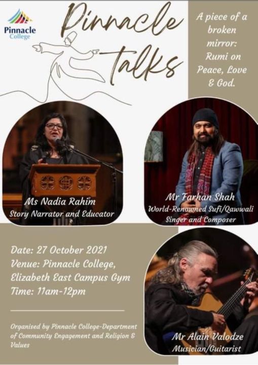 When not traveling or performing at live events, Farhan shares his experiences offering workshops on Tasawwuf and Sufi music along with Nadyah Rahim (Story narrator, Educator) at the local schools and colleges in Australia.