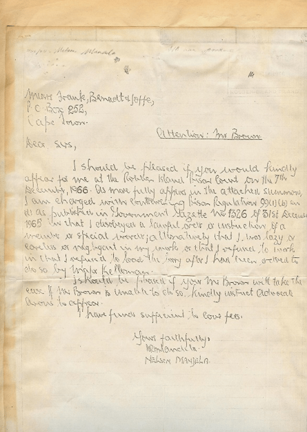 It is against this background that Brown relates a new encounter — his momentous chance meeting with Nelson Mandela which took place through Joel Joffe, a leading South African lawyer who had been part of Mandela’s Defence team at the famous Rivonia Trial some 3 years earlier. Mandela was summoned to appear for disciplinary proceedings in the Robben Island Prison Court and in his own curly neat handwriting writes a letter to FB&J marked “Attention: Mr Brown”. In this letter Mandela asks Brown to represent him on a charge for violating a disciplinary rule and for ‘laziness’.