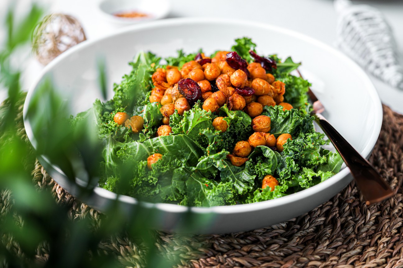 Click to read the full blog and get the recipe: Massaged Kale Salad With Spicy Roasted Chickpeas