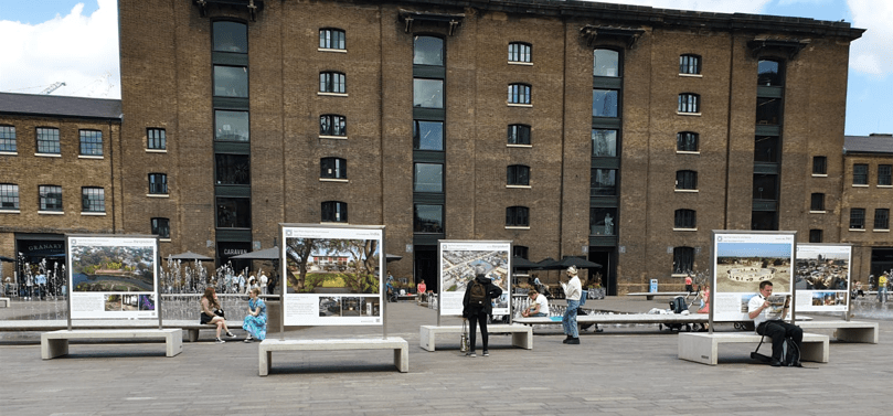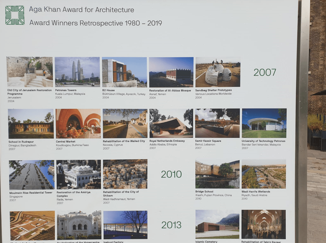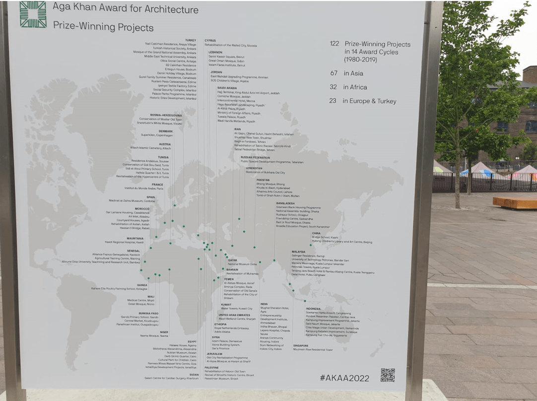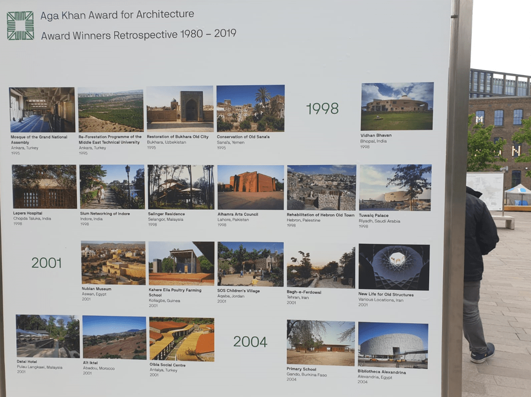 Contributed by Karim Jivraj: Twenty short-listed projects nominated for the Aga Khan Award for Architecture Award are on display at Coal Yards Drop, in the vicinity of the Aga Khan Centre, as part of the Kings Cross Outdoor Art Project. The projects have been selected by a Master Jury, from over 450 projects for the 2020-2022 cycle. (See shortlisted projects). The display will run until June 30.