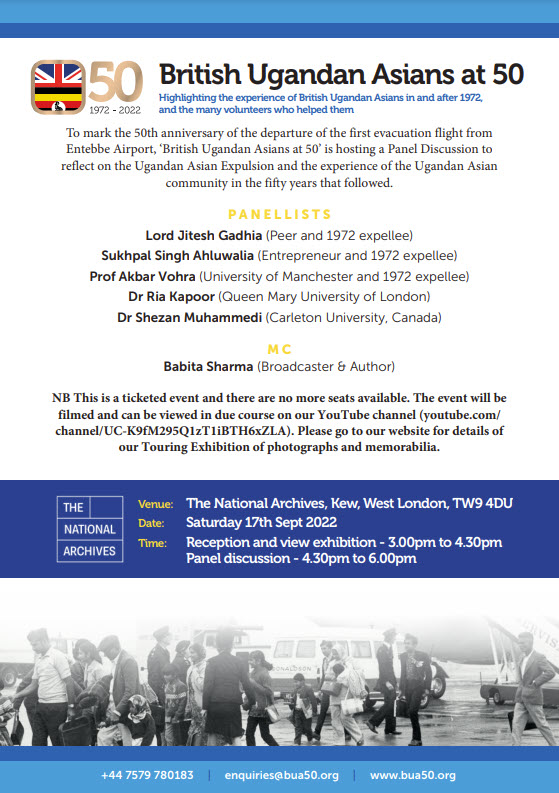 The British Ugandan Asians at 50 (BUA@50) is a programme that highlights the experience of British Ugandan Asians in and after 1972, and the many volunteers who helped them.