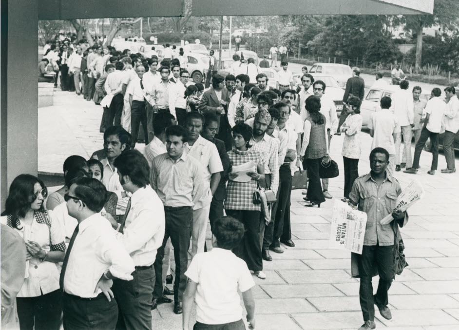 Uganda Asians queuing for help outside the office of the British High Commissioner, 1972. Photo: Courtesy  Mohamed Amin Foundation ©