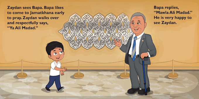 This book is about a young boy who learns the meaning of Ya Ali Madad and Mawla Ali Madad. The story takes place in the Ismaili Center Toronto Jamatkhana where the little boy goes through typical encounters. He comes across a wide variety of people such as volunteers, seniors, family members, and friends in rich illustrated scenes that creates opportunities for memorable discussion beyond just the text.