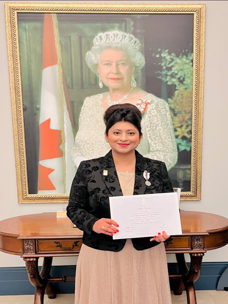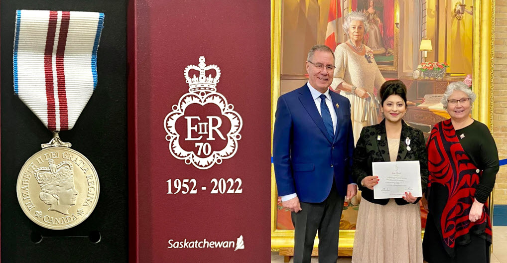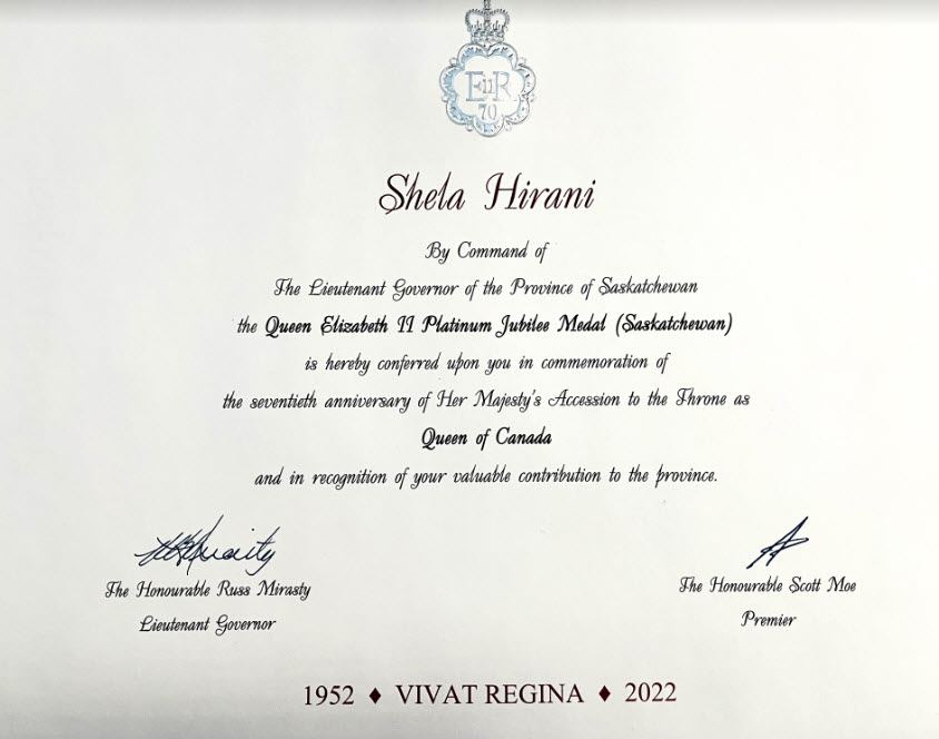On January 19, 2023, Dr Shela Hirani, Associate Professor at the University of Regina Faculty of Nursing, was was presented Queen Elizabeth II Platinum Jubilee Medal and a Certificate by the Lieutenant Governor of Saskatchewan, the Honourable Russ Mirasty and MLA for Regina-Pasqua Mr Muhammad Fiaz at Government House. She was awarded the honour in recognition of her outstanding contributions to the province of Saskatchewan, Canada.