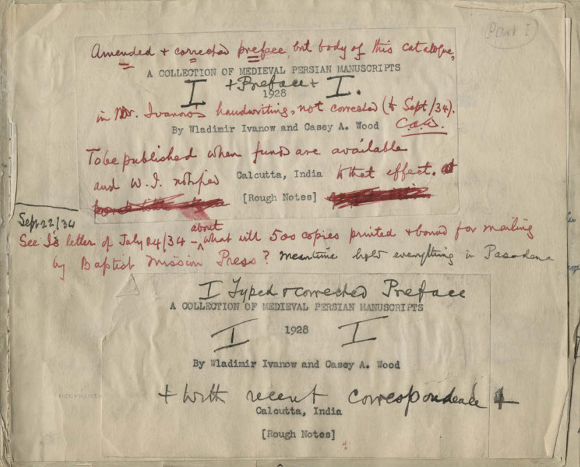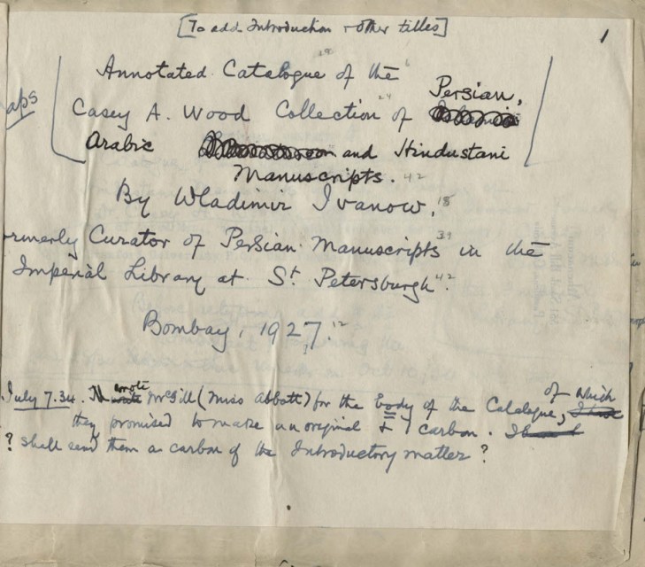 Wladimir’s handwritten catalogue preceded by a typescript title page labelled “rough notes.” Image: Annotated catalogue of the Casey A. Wood Collection of Persian, Arabic, and Hindustani manuscripts; Severson, The Dark Room, McGill Digitized Library