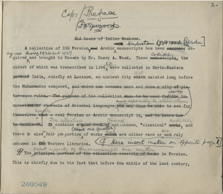 A handwritten and a typescript manuscript. Image: Annotated catalogue of the Casey A. Wood Collection of Persian, Arabic, and Hindustani manuscripts; Sarah Severson/The Dark Room, McGill Digitized Library