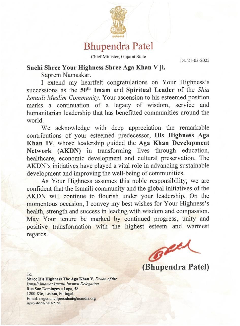 India – AKV and AKIV – CM Gujarat State Bhupendra Patel April 15, 2025 Global: Why the World Celebrates His Late Highness Prince Karim Aga Khan IV | Constellation of Honours: Over 300 Accolades from 55 Countries 945 × 1280 Message from India’s Chief Minister for the State of Gujarat, Bhupendra Patel Message from India’s Chief Minister for the State of Gujarat, Bhupendra Patel