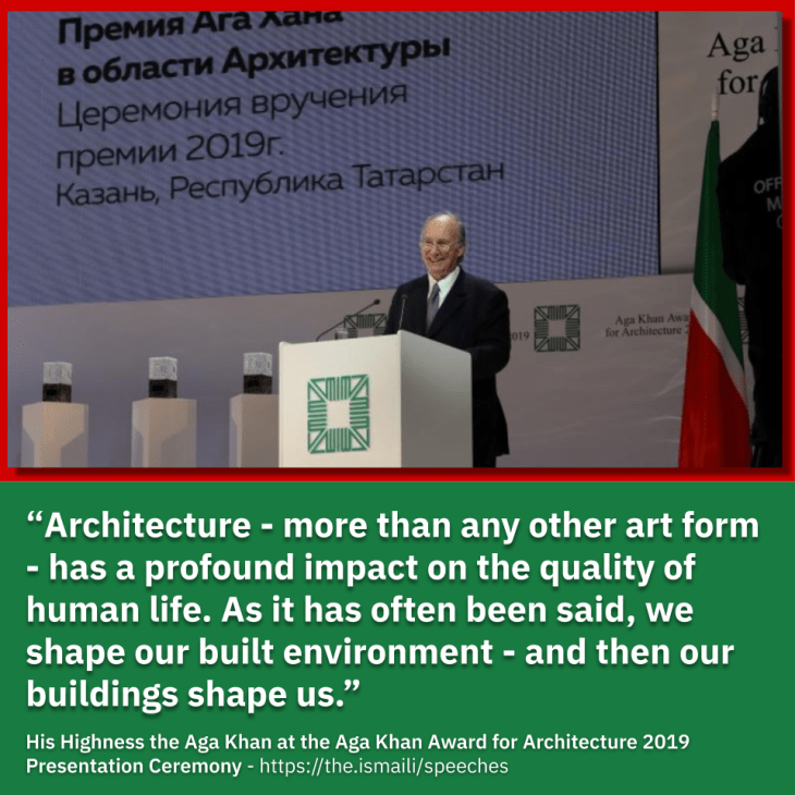 His Late Highness Prince Karim Aga Khan’s architectural endeavours have received wide recognition with the highest levels of distinction from around the world in terms of awards, honorary fellowships and medals by Architectural Institutes from Canada, France, Spain, UK, USA, as well as an Insignia of Honour from The International Union of Architects.