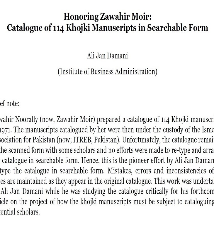 Zawahir Noorally (now, Zawahir Moir) prepared a catalogue of 114 Khojki manuscripts in 1971. The…